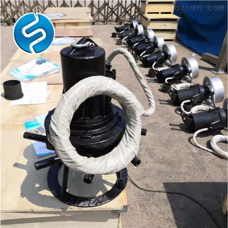 潛水曝氣機(jī)由潛污泵、混合室、底座、進(jìn)氣管和消音器組成。進(jìn)氣管上端為空氣吸入口位于水面之上,下端與混合室聯(lián)通,接通電源后由于葉輪旋轉(zhuǎn),高速水流從葉輪出口流出經(jīng)混合室形成負(fù)壓,因而空氣經(jīng)氣室被吸入并與污水混合,氣、水混合液從出口噴射出,完成對(duì)污水的充氧。